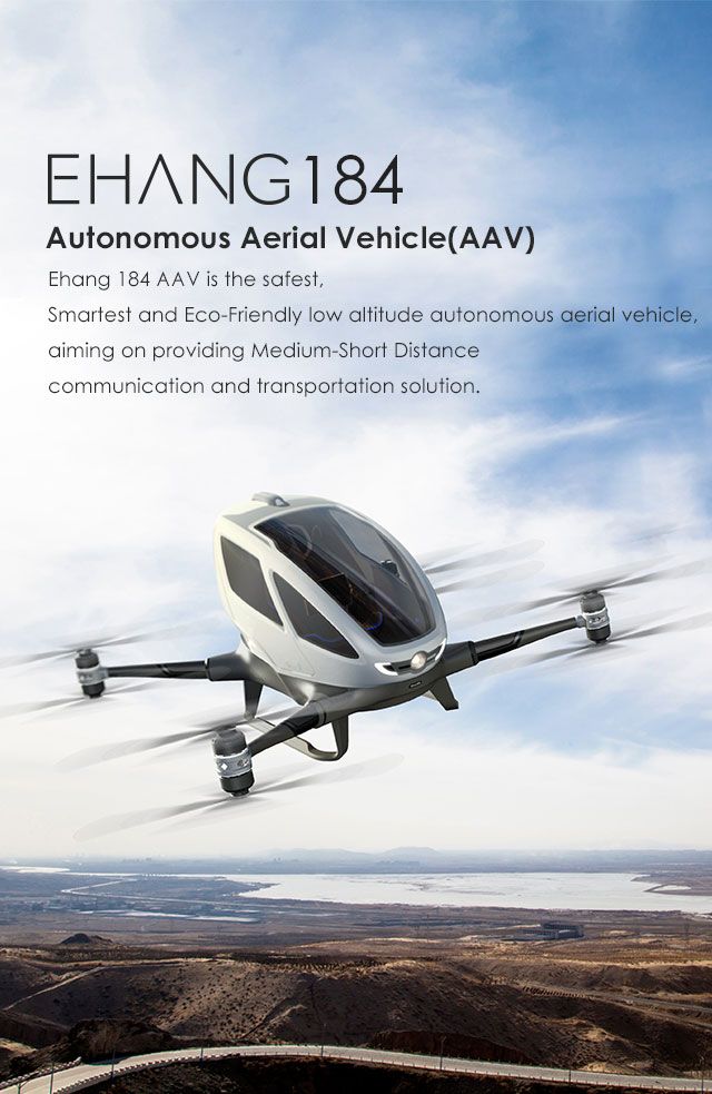 The EHang 216 is an autonomous aerial vehicle (AAV) tested in Guangzhou. With a top speed of 130 km/h (80 mph), it could become the future of urban transport.